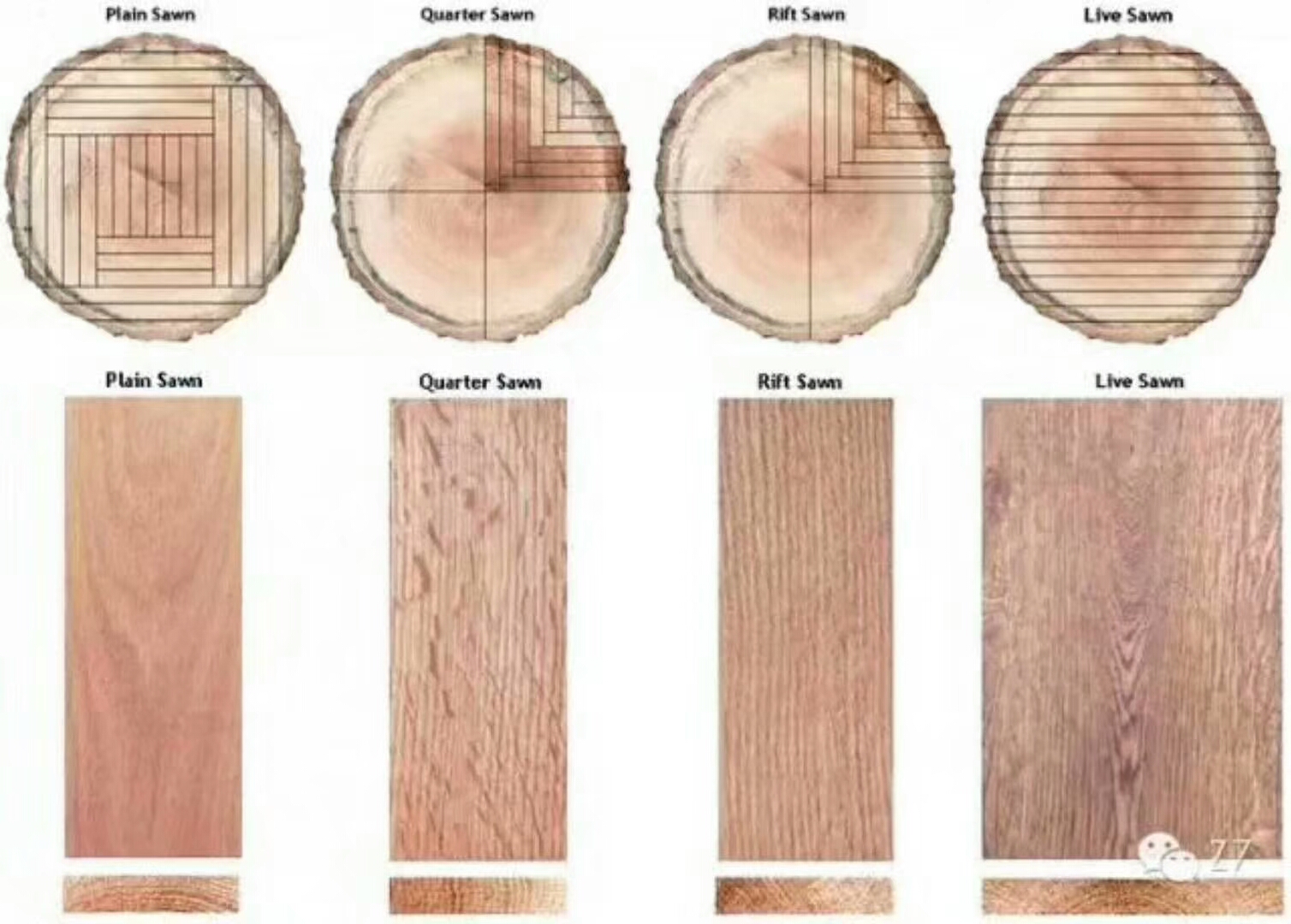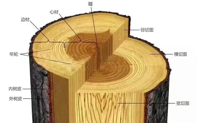 正常径切开料法,木块板头尾方向有着笔直的纹路,而且侧面纹路也垂直、笔直呈90°。